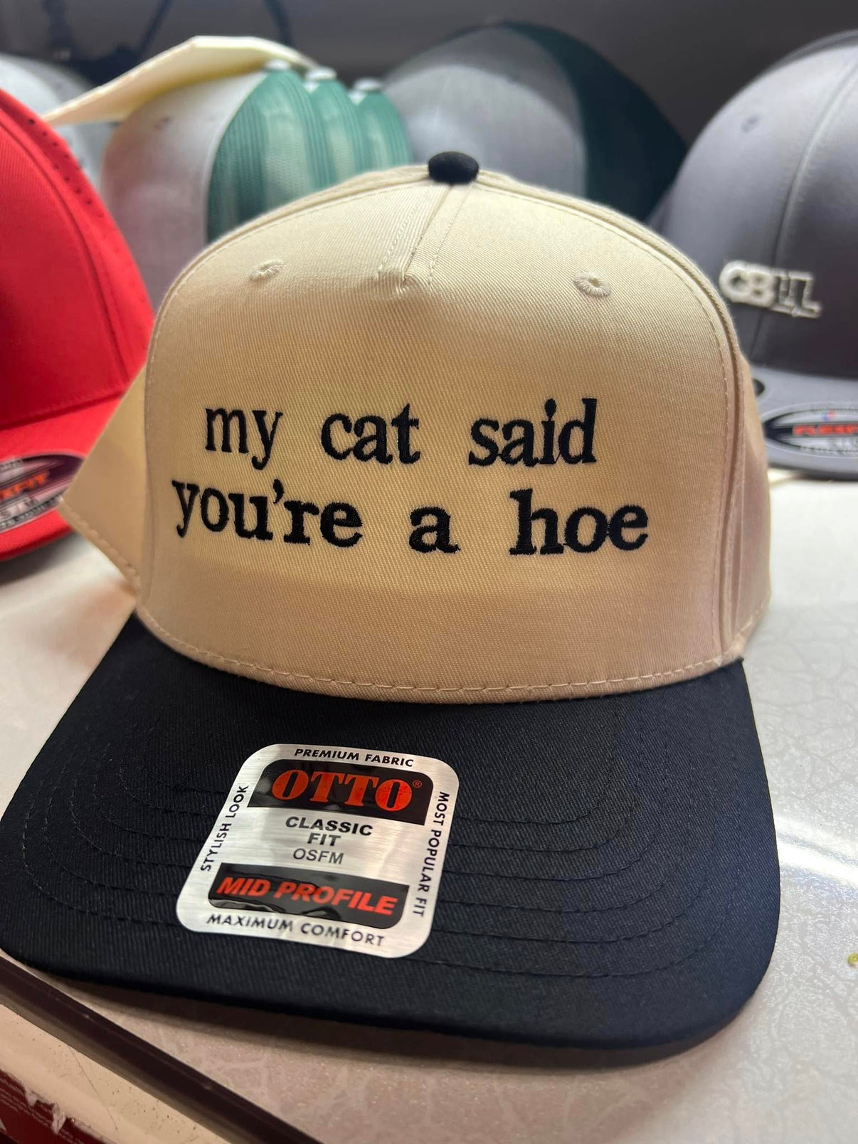 Stand out with this bold hat featuring the playful phrase "My Dog Says You're a Hoe." Designed for those who love to mix humor with style, this hat adds a fun edge to any outfit. Comfortable and durable, it’s perfect for casual outings or making a statement wherever you go. Show off your unique personality with confidence.